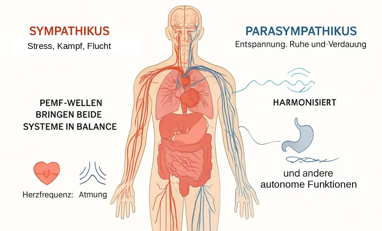 PEMF kann Ionenkanäle in den Nervenzellen beeinflussen und das parasympathische Nervensystem aktivieren, Ihren körpereigenen „Ruhe- und Regenerationsmodus“.